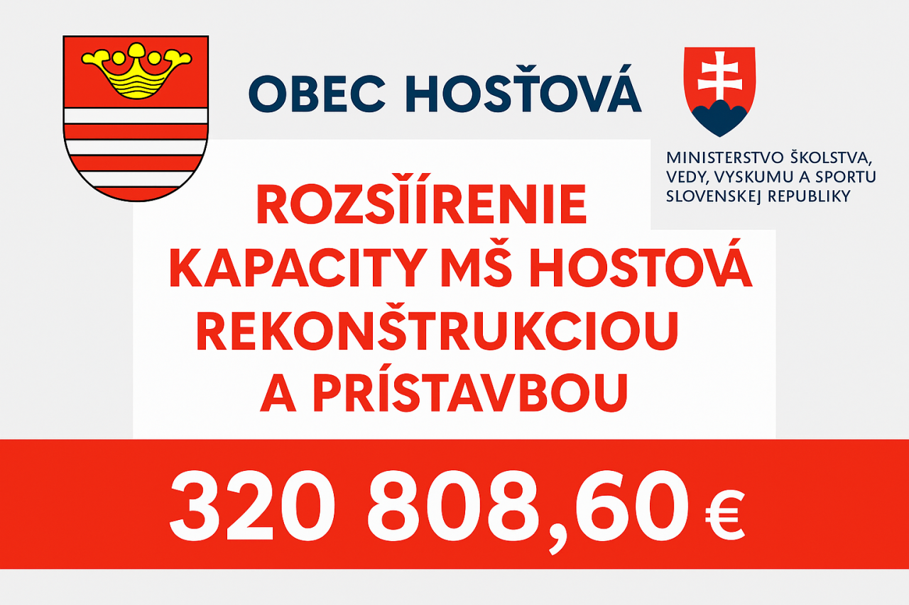 S potešením Vám oznamujeme, že naša obec získala nenávratný finančný príspevok vo výške 320 808,60 € z mechanizmu na podporu obnovy a odolnosti na rozšírenie a modernizáciu Materskej školy v Hosťovej formou rekonštrukcie a prístavby, ktoré prispejú k zvýšeniu kapacity školy a zlepšeniu podmienok pre deti.